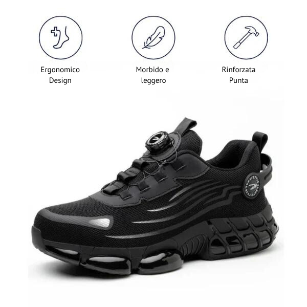 • Punta larga e rinforzata: protegge le dita dei piedi ed è perfetta per i piedi larghi e l'alluce valgo.