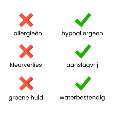 - Resistente all'acqua, al sudore e al calore. (Nessuna scoloritura, nessuna ossidazione).