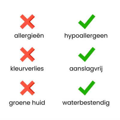 - Resistente all'acqua, al sudore e al calore. (Nessuna scoloritura, nessuna ossidazione).