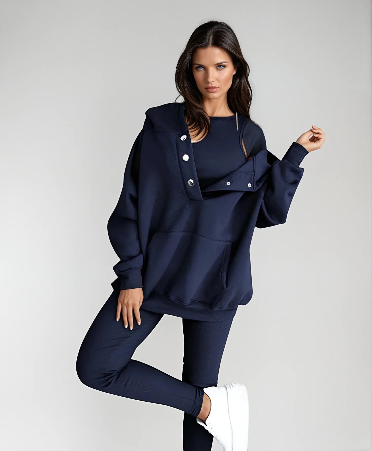Set completo 3 in 1: Include felpa con cappuccio, camicia e leggings: tutto ciò che serve per un look autunnale raffinato.