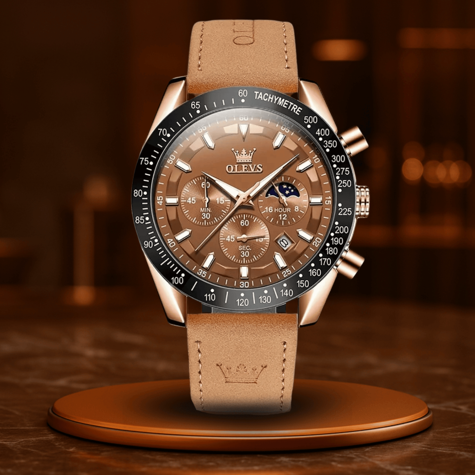 Il Lunaris Chrono è progettato per uomini che non solo pianificano, ma creano. Il suo design elegante e raffinato con cinturino in vera pelle marrone porta un'eleganza classica al tuo polso, mentre il preciso movimento al quarzo assicura che ogni secondo conti.