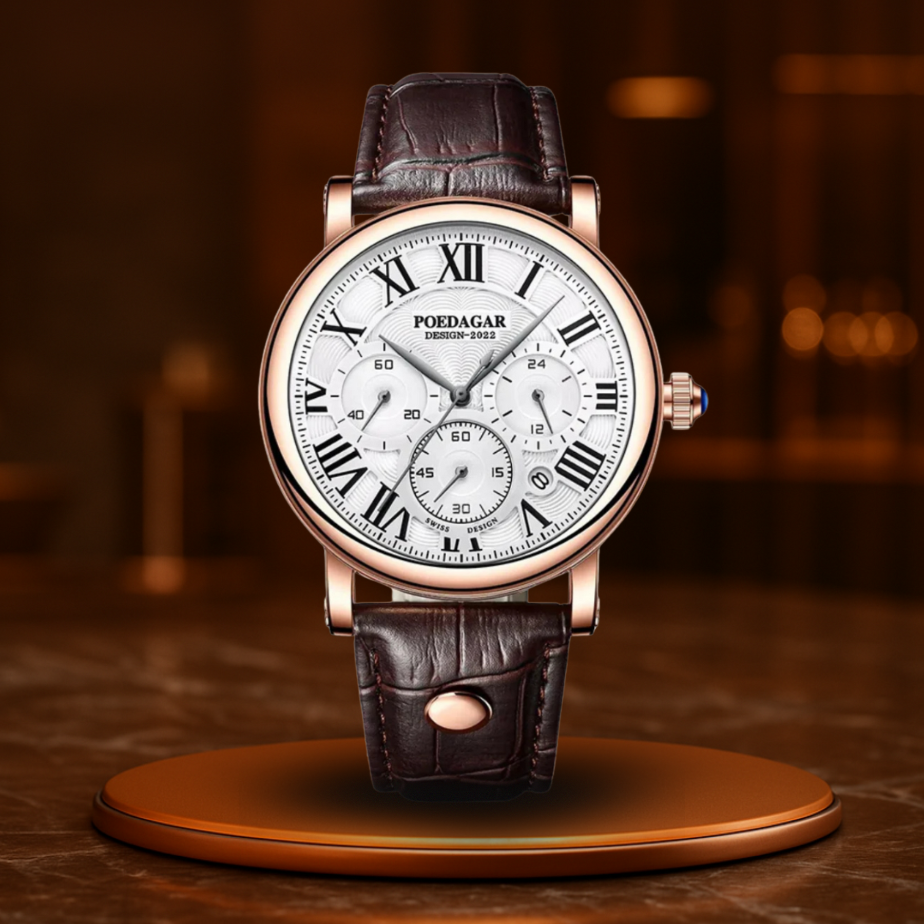 Il ChronoSport – Édition Élégance di Maison Royale è più di un semplice orologio – è un prolungamento della tua personalità. Con il suo elegante cinturino in pelle, il raffinato design del cronografo e la precisa tecnologia al quarzo, questo orologio è il compagno perfetto per l'uomo moderno che apprezza sia lo stile che la funzionalità.