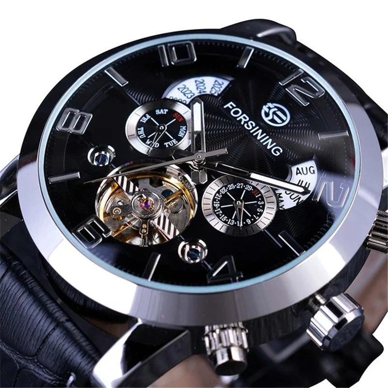Azionato da un movimento automatico a tourbillon, questo orologio è privo di batterie – e pieno di meccanica che ti solleva a un altro livello con la sua semplice esistenza. La funzione calendario e la costruzione pensata lo rendono adatto all'uso quotidiano, mentre il suo design assicura che non sembri mai banale.