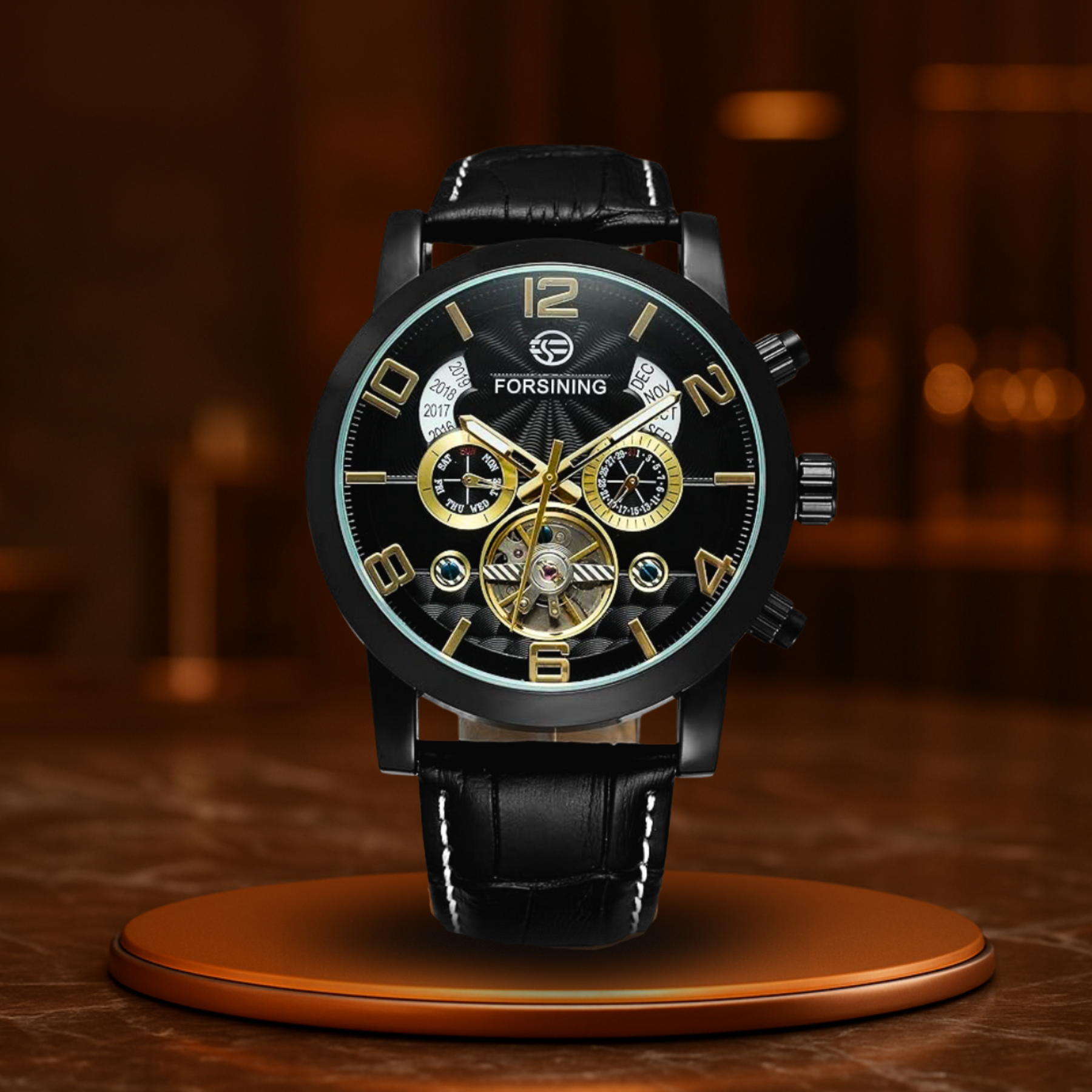 Il suo quadrante ondulato, incastonato in una cassa nera con accenti dorati, è come un'eco di controllo e carattere – perfetto per uomini che non solo sanno quando accade qualcosa, ma perché lo hanno deciso.