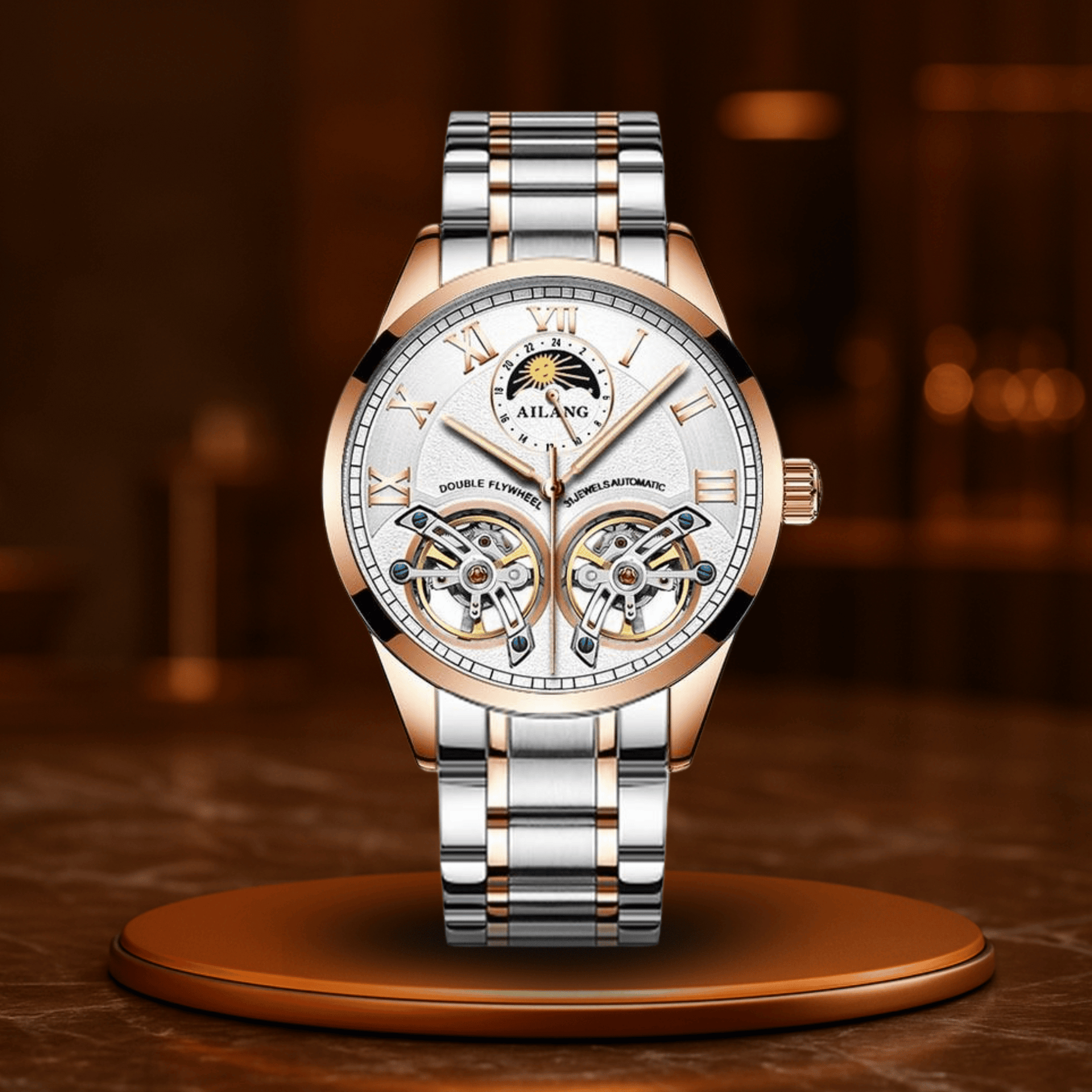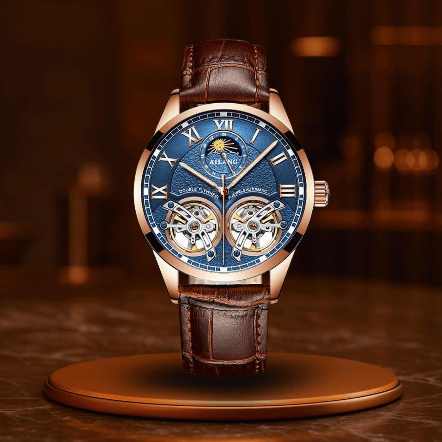 Il lussuoso bracciale in pelle si adatta morbidamente al polso, mentre la cassa da 41 mm bilancia perfettamente eleganza e presenza. L'indicatore delle fasi lunari? Un'inclinazione sottile verso il cielo – per uomini che pensano in grande, oltre gli appuntamenti.
